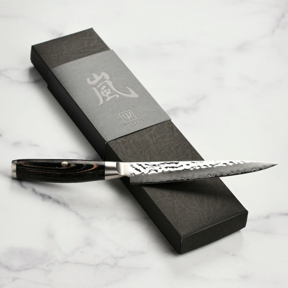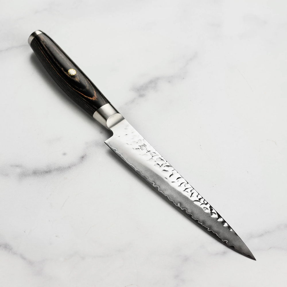 В основі тришарового леза – японська порошкова сталь SG2, що має високу твердість – 63 HRC за шкалою Роквела та надвисоку ріжучу здатність: ніж триматиме екстремальну гостроту довгий період до заточування. Кут заточування становить 12,5⁰ з кожного боку.