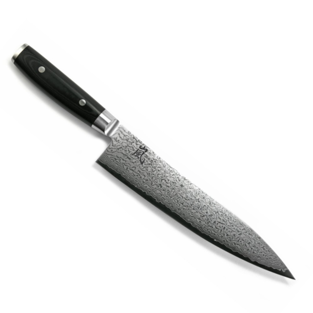 Японський шеф-ніж серії RAN з лезом із дамаської сталі 24 см підходить для щоденного використання на професійній або домашній кухні, оскільки витримує будь-яке робоче навантаження. В основі високоякісна сталь VG10 (кобальт, молібден, ванадій), покрита захисними обкладками із 68 шарів нержавіючої сталі з ефектним дамаським візерунком на лезі.