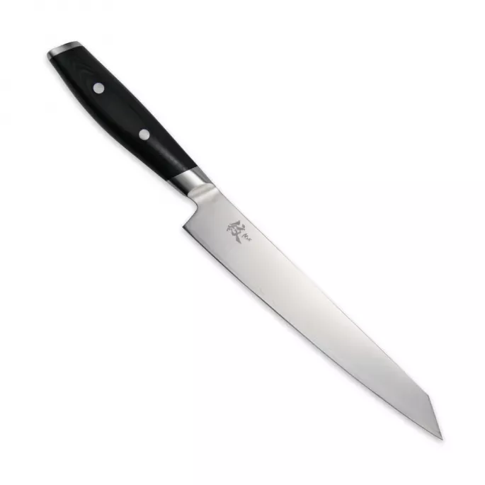 Японський кухонний ніж для нарізки серії MON з лезом 23 см з дамаської сталі підходить для щоденного використання на професійній або домашній кухні, оскільки витримує будь-яке робоче навантаження. Використовується для нарізки різного виду продуктів. Завдяки довгому і рівному лезу з гострою ріжучою кромкою легко впорається з делікатною нарізкою і слайсируванням хамона, шинки та інших продуктів.