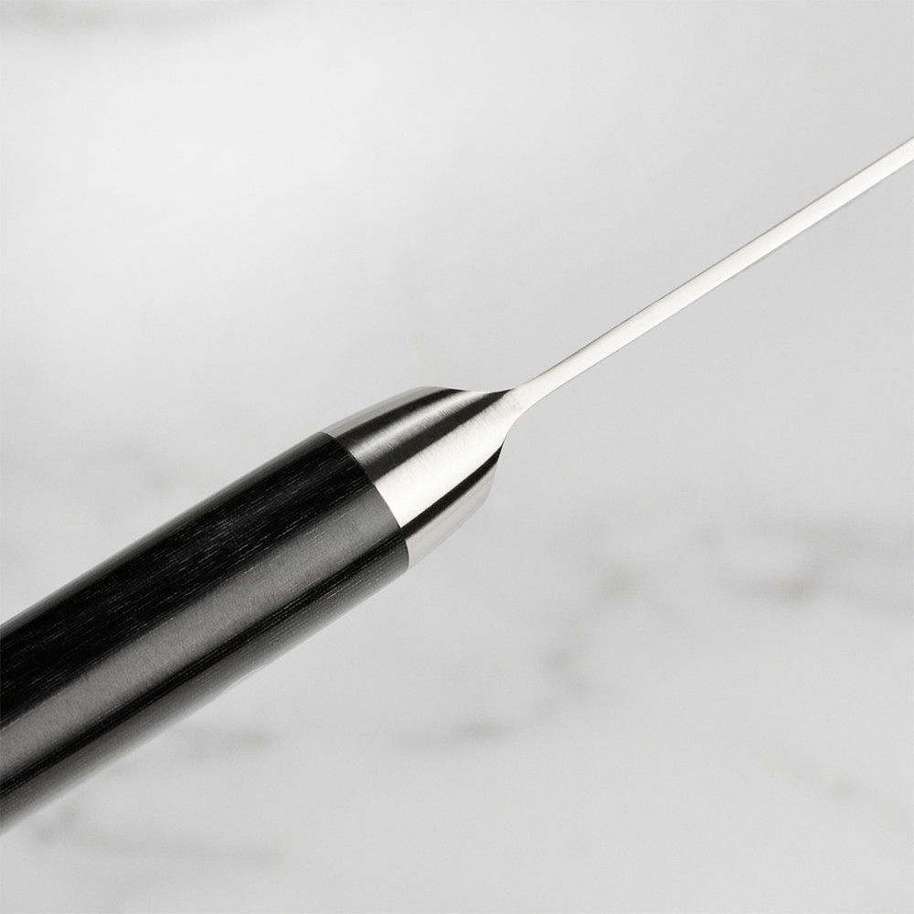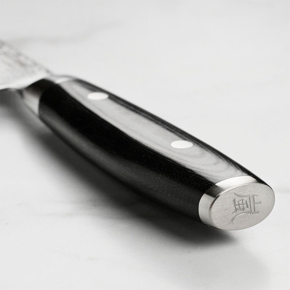 Ідеально відполірована чорна рукоятка кухонного ножа Yaxell RAN PLUS виготовлена з матеріалу канва мікарта – це льон, просочений смолою. Це витривалий довговічний матеріал, який витримує інтенсивні навантаження, не вбирає запахи. Рукоятка надійно закріплена, на кінці має металеве навершя для кращого балансування ножа. На рукоятці вигравірований ієрогліф лого серії.
