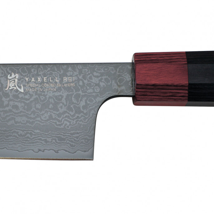 Серія японських ножів REI – новинка Yaxell 2024 –в перекладі з японської «Чорний». В основі високоякісна сталь VG10 (кобальт, молібден, ванадій), покрита захисними обкладками із 69 шарів нержавіючої сталі з ефектним дамаським візерунком на лезі. Крім того леза ножів серії REI вкриті спеціальним покриттям DLC (Diamond like Carbon-алмазоподібний вуглець). Дане покриття допомагає зберігати твердість леза, протистояти зношенню, корозії та забрудненню. Твердість леза – 61 одиниця (HRC) за шкалою Роквелла гарантує тривале збереження ріжучої здатності кухарського ножа.