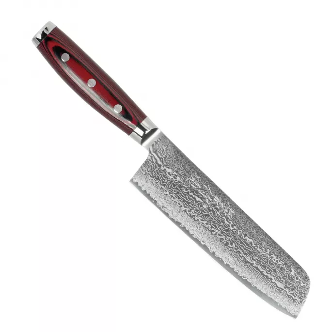 Японський ніж Накірі серії Super GOU з тонким прямокутним лезом із дамаської сталі 18 см використовується переважно для роботи з овочами та фруктами для нарізання та шинковки. В основі високоякісна японська порошкова сталь SG2, покрита захисними обкладками із 160 шарів нержавіючої сталі з ефектним дамаським візерунком на лезі.