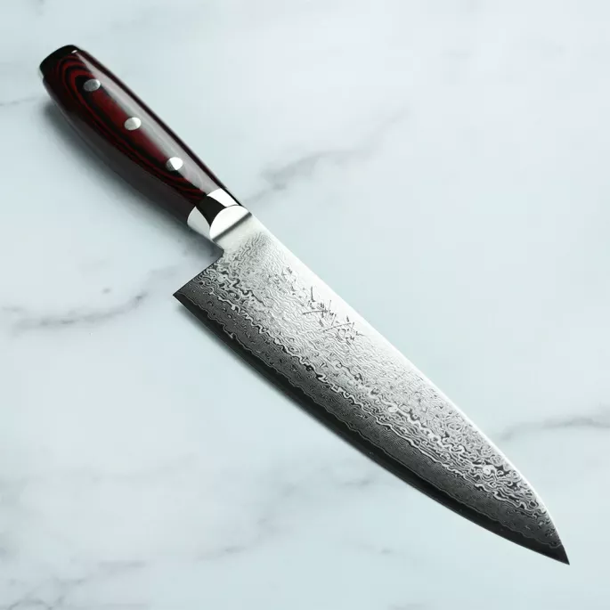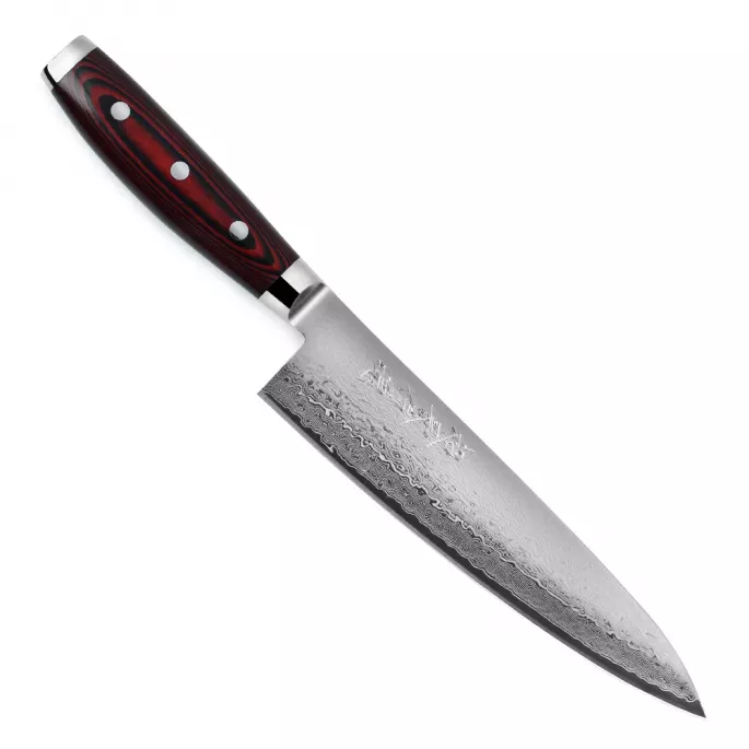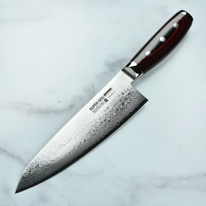 Японський шеф-ніж серії Super GOU з лезом із дамаської сталі 20 см підходить для щоденного використання на професійній або домашній кухні, оскільки витримує будь-яке робоче навантаження. В основі високоякісна японська порошкова сталь SG2, покрита захисними обкладками із 160 шарів нержавіючої сталі з ефектним дамаським візерунком на лезі.