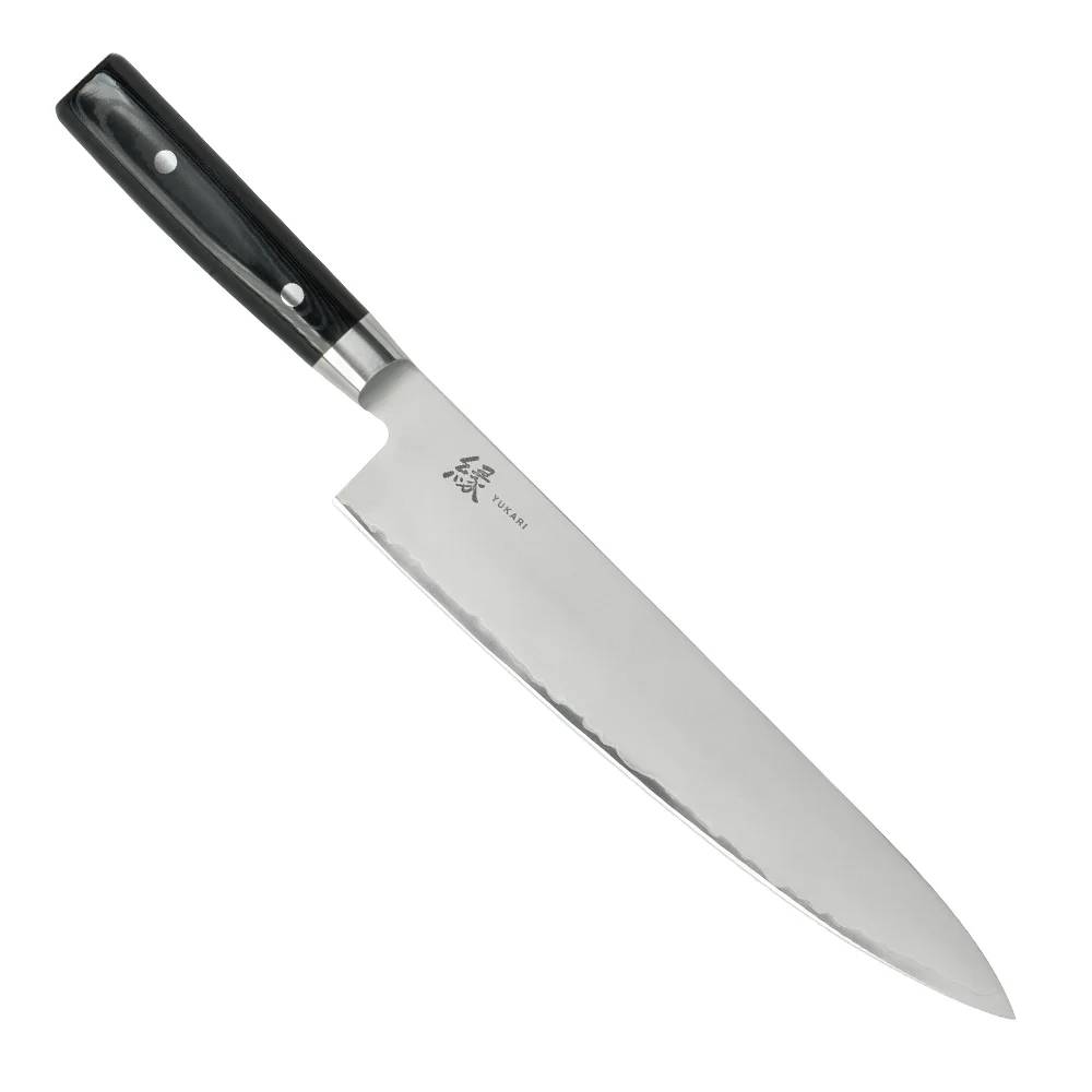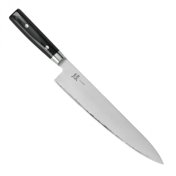 Японський кухарський шеф-ніж YUKARI з лезом із дамаської сталі 25,5 см підходить для щоденного використання на професійній або домашній кухні, оскільки витримує будь-яке робоче навантаження. Використовується для нарізки різного виду продуктів. Має невисоку прямокутну п’ятку і рівну лінію ріжучого краю з легким заокругленням на кінці.