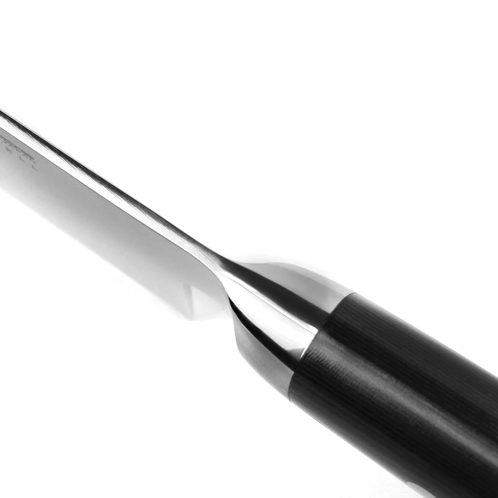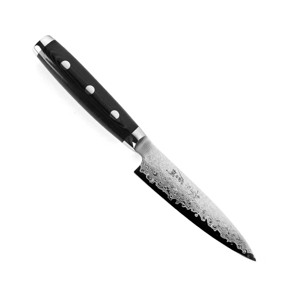 Японський кухонний ніж серії GOU з лезом з дамаської сталі 12 см підходить для щоденного використання на професійній або домашній кухні, оскільки витримує будь-яке робоче навантаження. В основі високоякісна японська порошкова сталь SG2, покрита захисними обкладками із 100 шарів нержавіючої сталі з ефектним дамаським візерунком на лезі.
