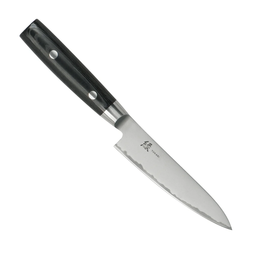 Японський кухонний ніж серії YUKARI з лезом із дамаської сталі 12 см підходить для щоденного використання на професійній або домашній кухні, оскільки витримує будь-яке робоче навантаження. В основі високоякісна сталь Movax (хром, молібден, ванадій), покрита захисними обкладками із 3 шарів нержавіючої сталі. Сталь Movax понад 30 років є одним із найпопулярніших матеріалів для вигогтовлення лез кухонних ножів, що продаються по всьому світу.На лезі вигравіруваний напис у вигляді ієрогліфів – “YUKARI Довга традиція”.
