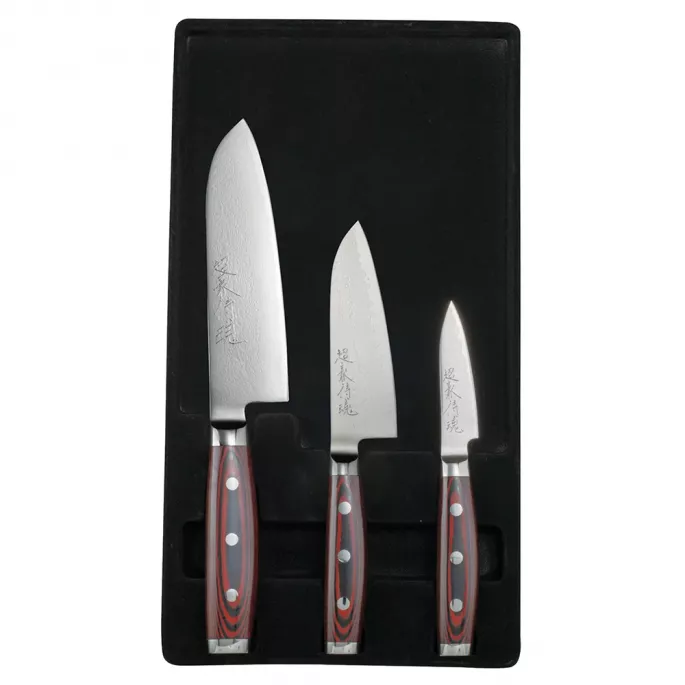 Набір японських ножів Яксель, серії Super GOU з лезом із дамаської сталі складається з трьох предметів: