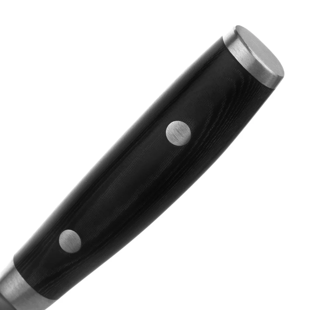 Ідеально відполірована чорна рукоятка кухонного ножа Yaxell RAN виготовлена з матеріалу канва микарта - це льон, просочений смолою. Це витривалий довговічний матеріал, який витримує інтенсивні навантаження, не вбирає запахи. Рукоятка надійно закріплена, на кінці має металеве навершя для кращого балансування.