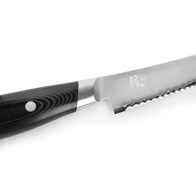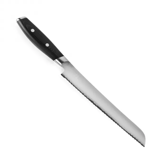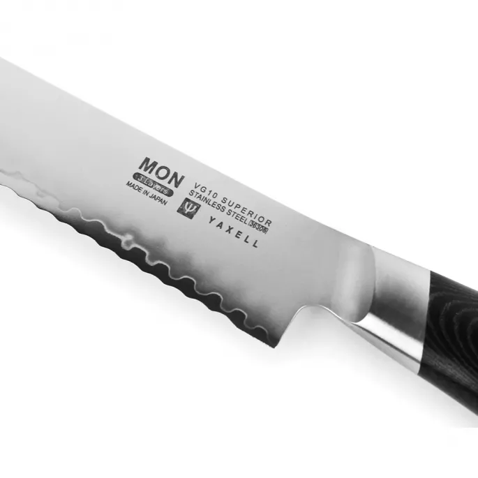 Японський кухонний ніж для хліба серії MON з лезом 23 см з дамаської сталі підходить для щоденного використання на професійній або домашній кухні, оскільки витримує будь-яке робоче навантаження. Використовується як ніж для хліба, ніж для торта, кондитерський ніж і т.п. Пилоподібна форма ріжучої кромки серрейторного ножа дозволяє делікатно розрізати м'якоть і скоринку хліба або виробів з тіста.
