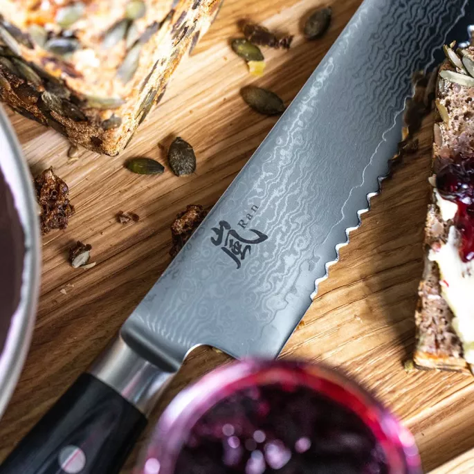 Японський ніж серії RAN з серрейторним лезом із дамаської сталі 23 см підходить для щоденного використання на професійній або домашній кухні, оскільки витримує будь-яке робоче навантаження. Використовується як ніж для хліба, ніж для торта, кондитерський ніж і т.п. Пилоподібна форма ріжучої кромки серрейторного ножа дозволяє делікатно розрізати м'якоть і скоринку хліба або виробів з тіста.