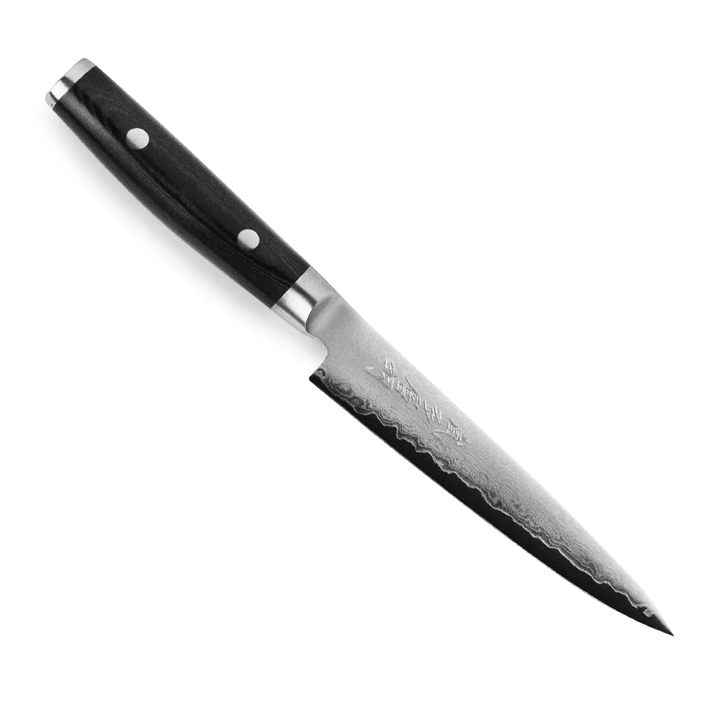 Японський кухонний ніж серії RAN PLUS з лезом із дамаської сталі 15 см підходить для щоденного використання на професійній або домашній кухні, оскільки витримує будь-яке робоче навантаження. Використовується для нарізки різного виду продуктів. Має невисоку прямокутну п'ятку і рівну лінію ріжучого краю з легким заокругленням на кінці.