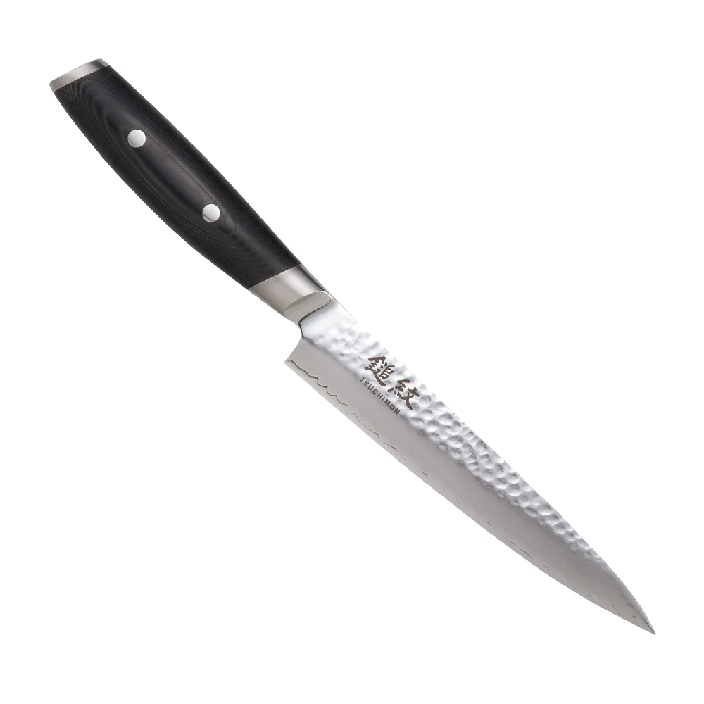 Японський кухонний ніж серії TSUCHIMON з лезом 18 см з дамаської сталі підходить для щоденного використання на професійній або домашній кухні, оскільки витримує будь-яке робоче навантаження. Використовується для нарізки різного виду продуктів. Має невисоку прямокутну п'ятку і рівну лінію ріжучого краю з легким заокругленням на кінці.