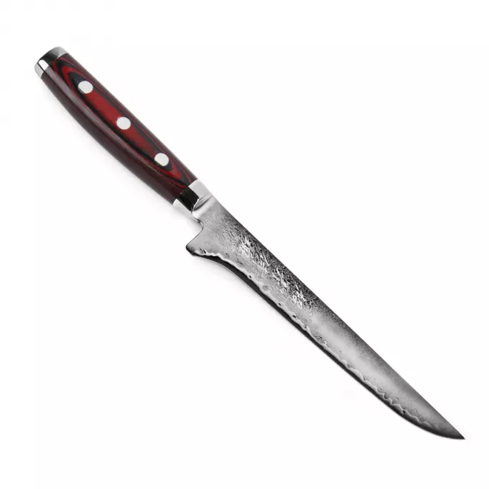 Японський обвалювальний ніж серії Super GOU з лезом із дамаської сталі 15 см підходить для щоденного використання на професійній або домашній кухні, оскільки витримує будь-яке робоче навантаження. Використовується для обробки м'яса, відділення м'ясної м'якоті від кісток. Має захисну п'ятку ергономічної форми, що запобігає зісковзуванню пальця на лезо.