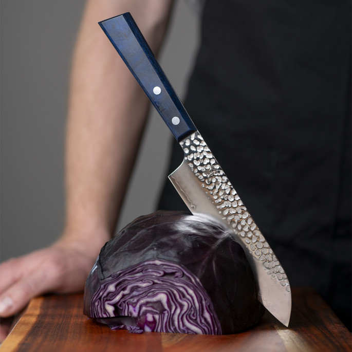 Лезвие изготовлено из трёхслойной нержавеющей стали с сердечником из легированной стали MOVAX, содержащей молибден, ванадий и хром. Твёрдость стали достигает 58 HRC по шкале Роквелла. Молоточковая текстура Tsuchime не только придаёт ножу ремесленный вид, но и предотвращает прилипание продуктов. Благодаря углу заточки 12,5° с каждой стороны, лезвие отличается исключительной остротой и точностью.