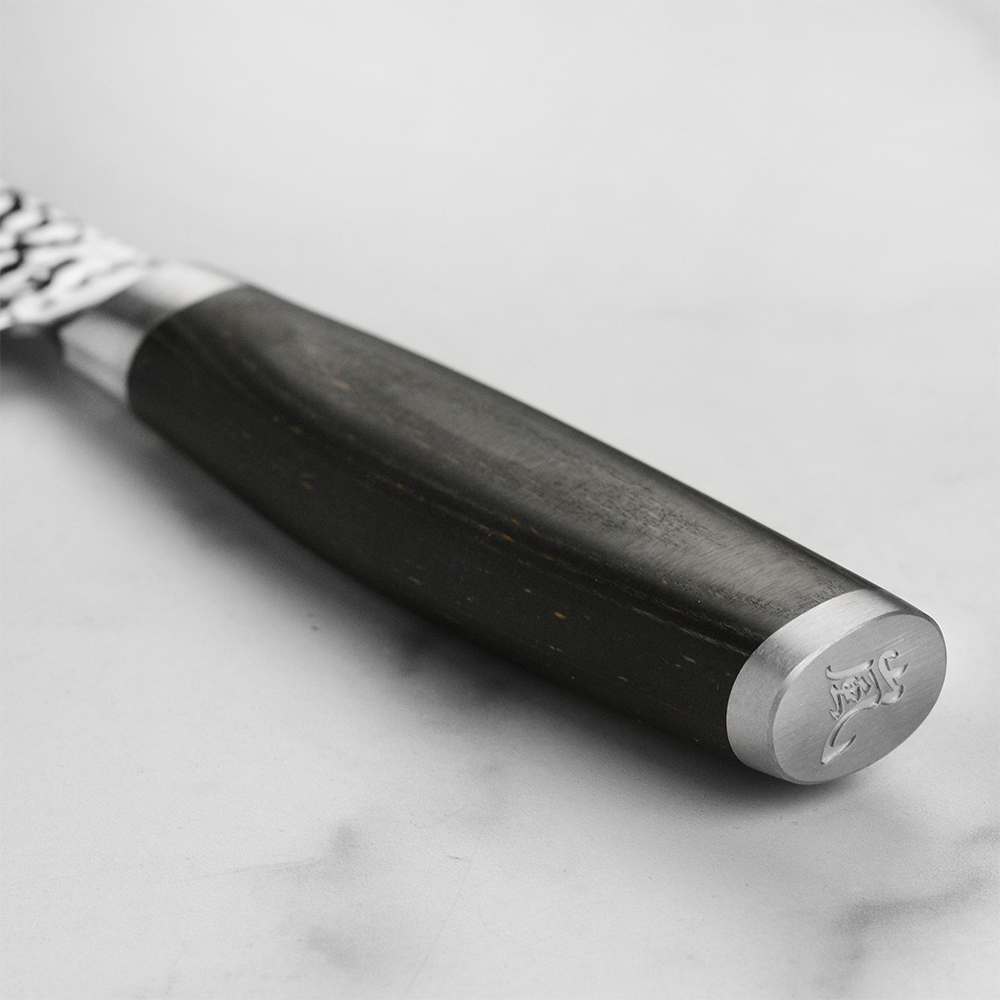 Нож из серии TAISHI легко узнать благодаря оригинальному узору, который образуется в результате ударов японским молотом Тсушиме. Помимо декоративного эффекта такие углубления на лезвии обладают еще и функциональной особенностью. Они служат своеобразными воздушными капсулами, благодаря чему продукты не прилипают к лезвию ножа.