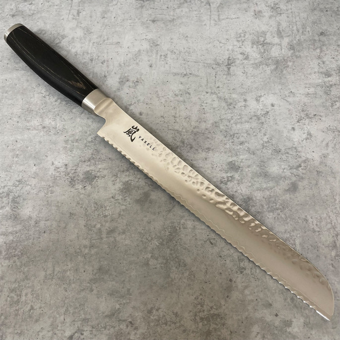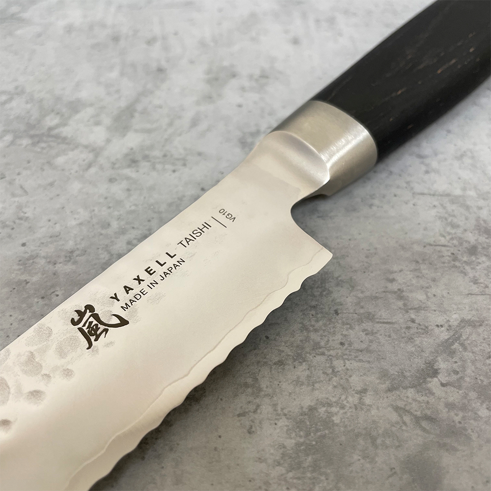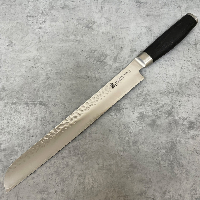 Японский нож серии TAISHI с серрейторным лезвием из дамасской стали 23 см подходит для ежедневного использования на профессиональной или домашней кухне, поскольку выдерживает любую рабочую нагрузку. Используется как нож для хлеба, нож для торта, кондитерский нож и т.п. Пилообразная форма режущей кромки серрейторного ножа позволяет деликатно разрезать мякоть и корочку хлеба или изделий из теста.