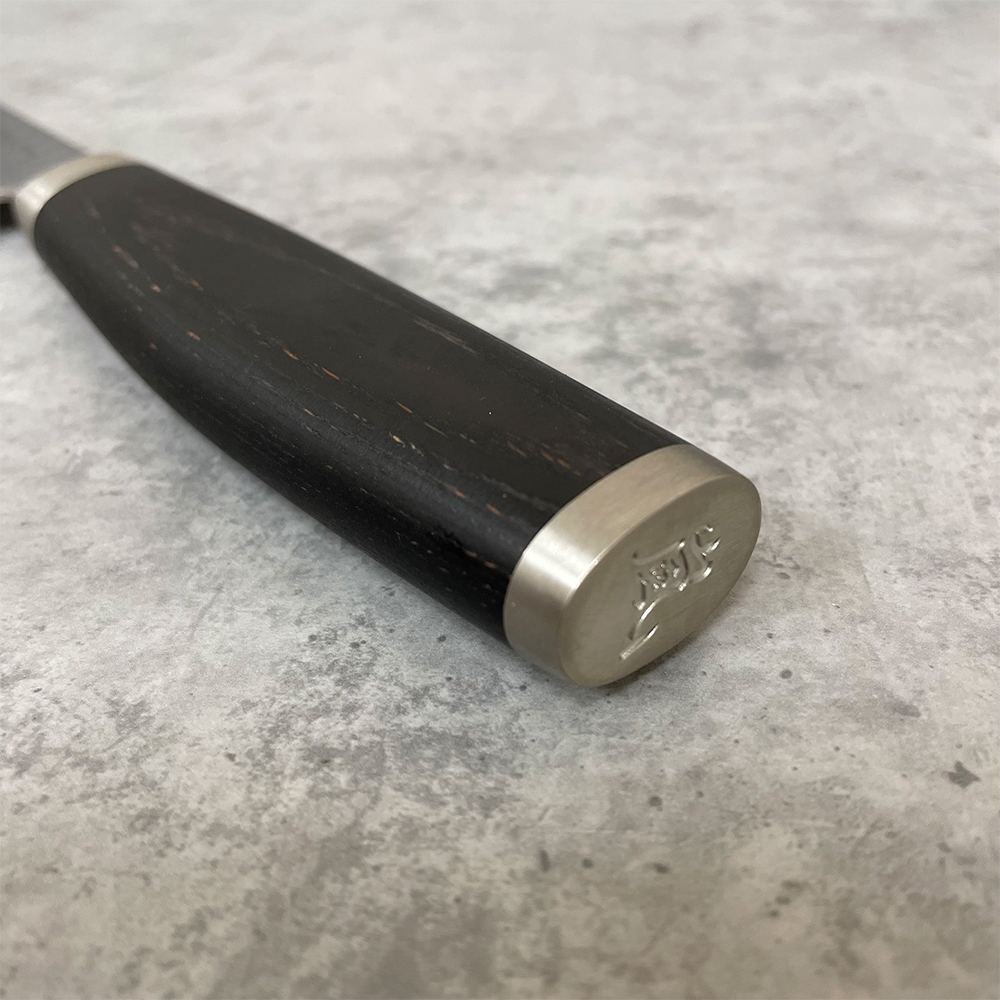 Нож имеет очень острую режущую кромку, симметричный угол заточки составляет 12,5°. Твердость лезвия – 61 единица (HRC) по шкале Роквелла гарантирует длительное сохранение режущей способности поварского ножа.