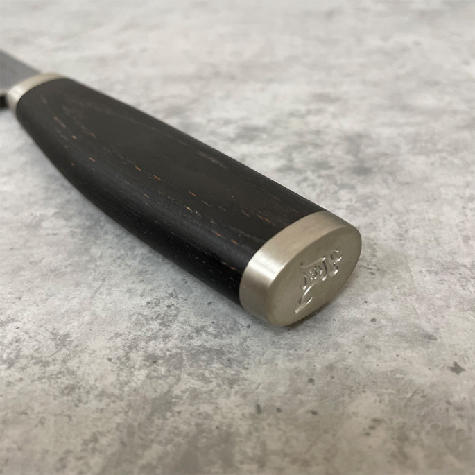 Идеально отполированная черная рукоятка кухонного ножа Yaxell TAISHI изготовлена из экологически чистой древесины черного бука и одобрена ЕС по регламенту безопасности пищевых продуктов.