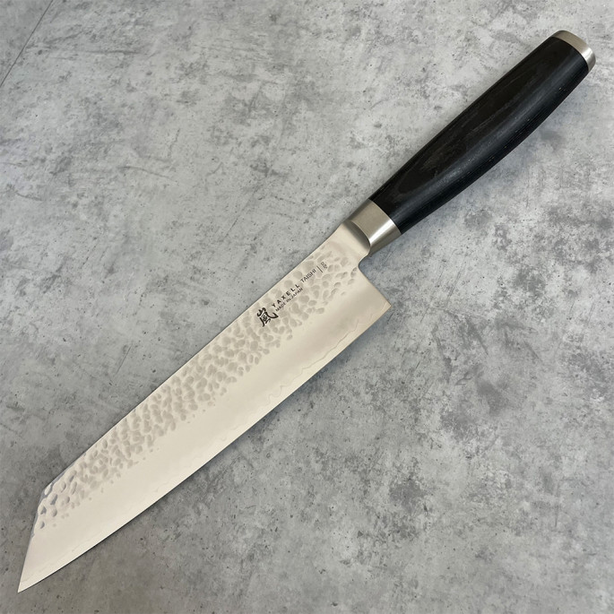 Нож из серии TAISHI легко узнать благодаря оригинальному узору, который образуется в результате ударов японским молотом Тсушиме. Помимо декоративного эффекта такие углубления на лезвии обладают еще и функциональной особенностью. Они служат своеобразными воздушными капсулами, благодаря чему продукты не прилипают к лезвию ножа.