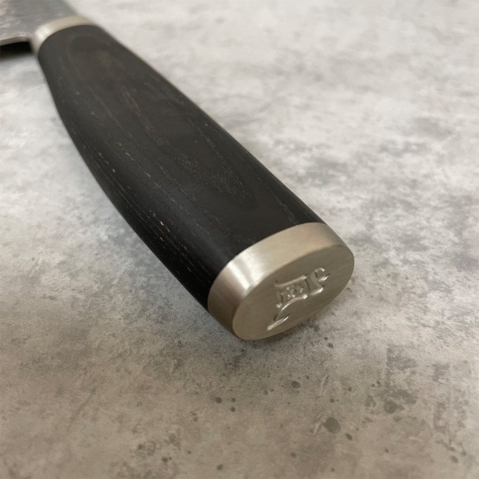 Нож имеет очень острую режущую кромку, симметричный угол заточки составляет 12,5°. Твердость лезвия – 61 единица (HRC) по шкале Роквелла, что гарантирует длительное сохранение режущей способности поварского ножа.