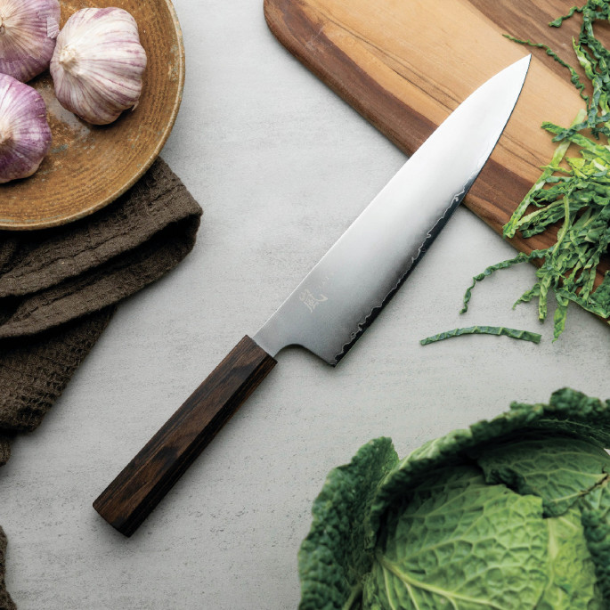 Премиальная восьмиугольная темно-коричневая ручка Pakka Wood (композит дерева и смолы), разработанная опытными дизайнерами Yaxell, обеспечивает идеальный баланс и оптимальный контроль.