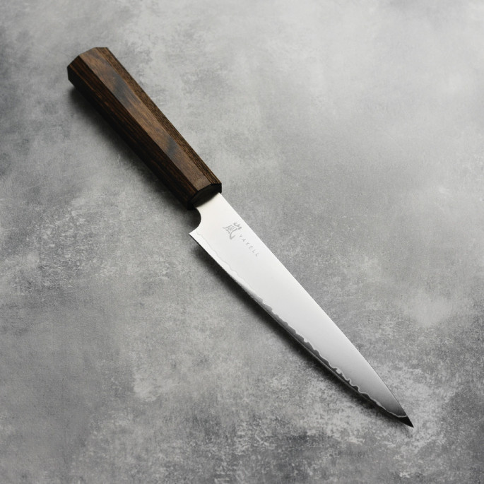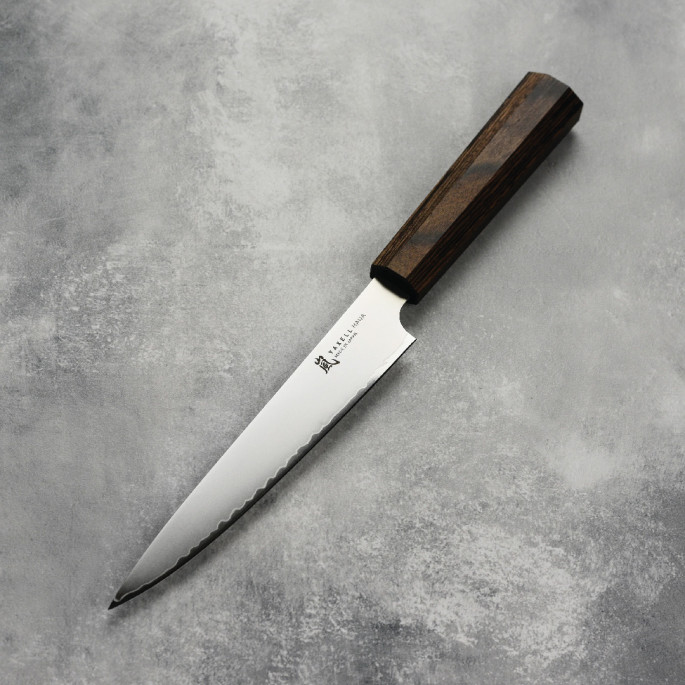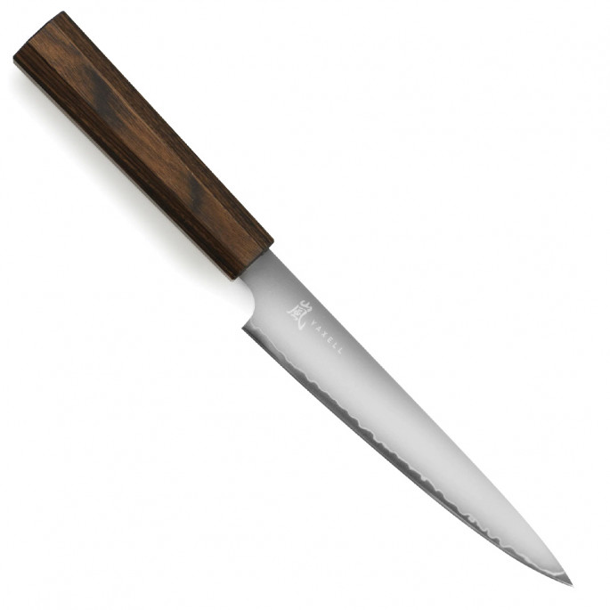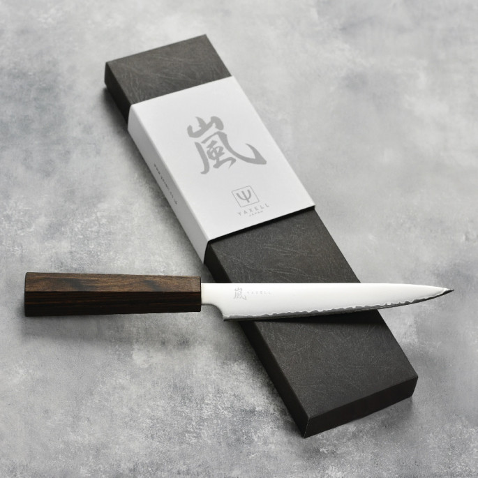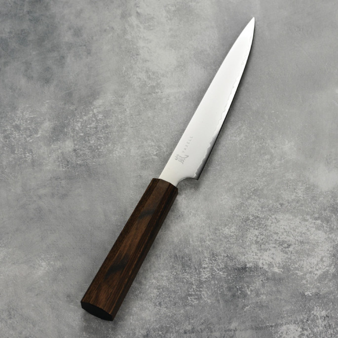 Премиальная восьмиугольная темно-коричневая ручка Pakka Wood (композит дерева и смолы), разработанная опытными дизайнерами Yaxell, обеспечивает идеальный баланс и оптимальный контроль.