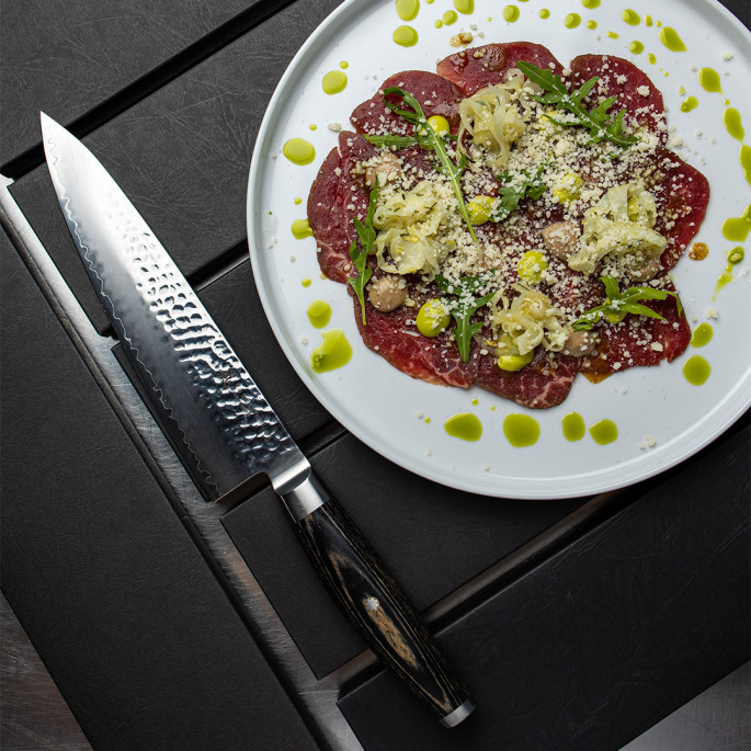В основе трехслойного лезвия – японская порошковая сталь SG2, имеющая высокую твердость – 63 HRC по шкале Роквелла и высокую режущую способность: нож будет держать экстремальную остроту долгий период до заточки. Угол заточки составляет 12,5⁰ с каждой стороны.