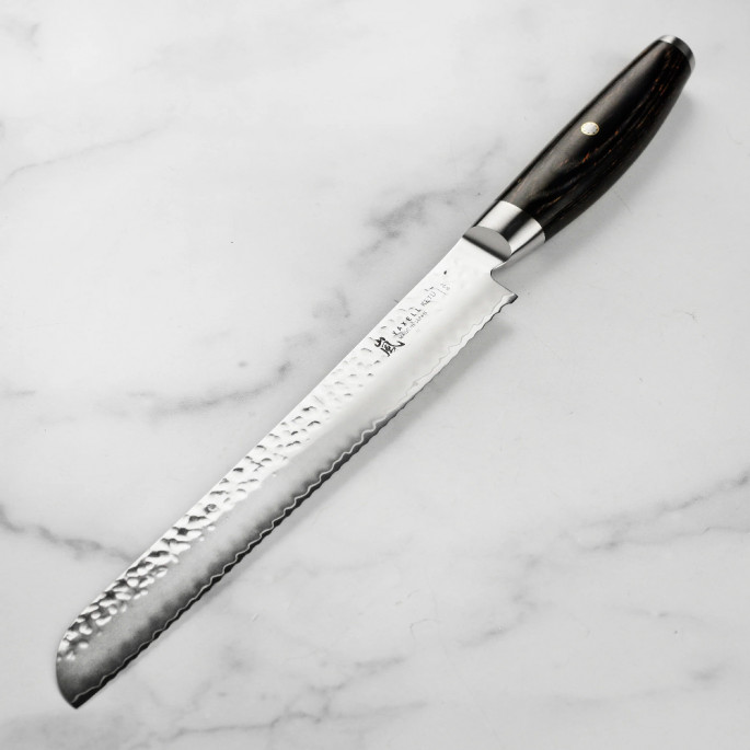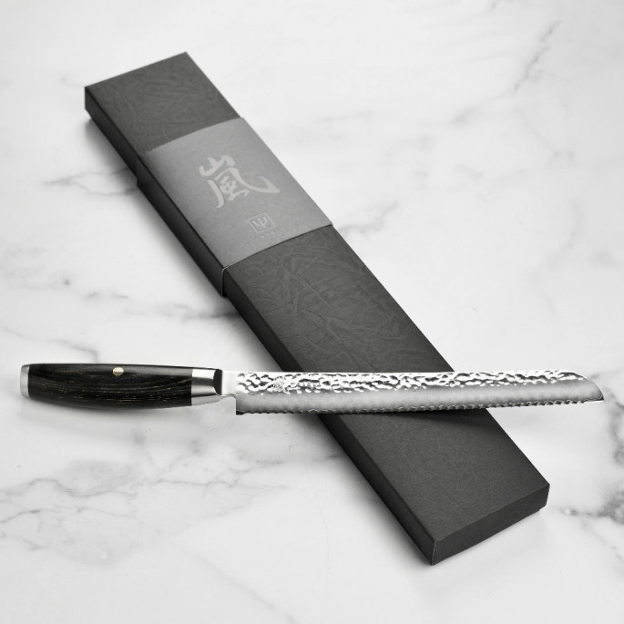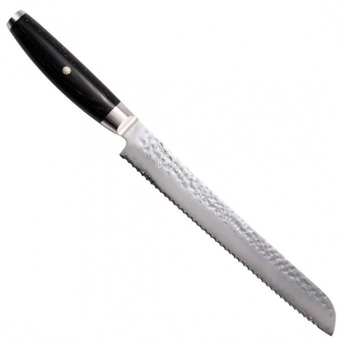 Японский нож для хлеба из дамасской стали серии KETU с серрейторным лезвием из дамасской стали 23 см подходит для ежедневного использования на профессиональной или домашней кухне, поскольку выдерживает любую рабочую нагрузку. Используется как нож для хлеба, нож для торта, кондитерский нож и т.п. Пилообразная форма режущей кромки серрейторного ножа позволяет деликатно разрезать мякоть и корочку хлеба или изделий из теста.