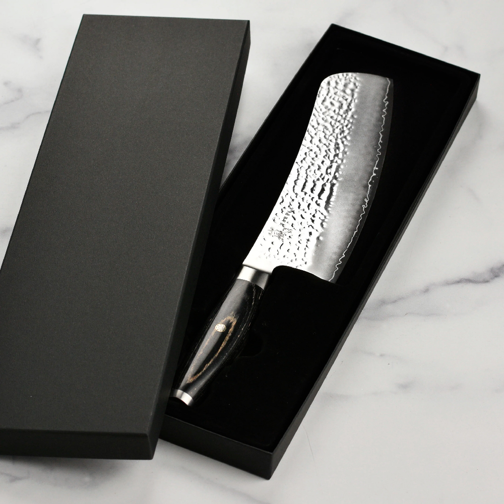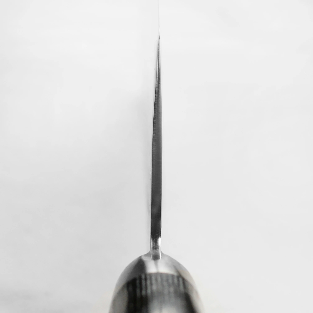 В основе трехслойного лезвия – японская порошковая сталь SG2, имеющая высокую жесткость – 63 HRC по шкале Роквела и сверхвысокую режущую способность: чем будет держать экстремальную остроту долгий период до заточки. Угол заточки составляет 12,5⁰ с каждой стороны.
