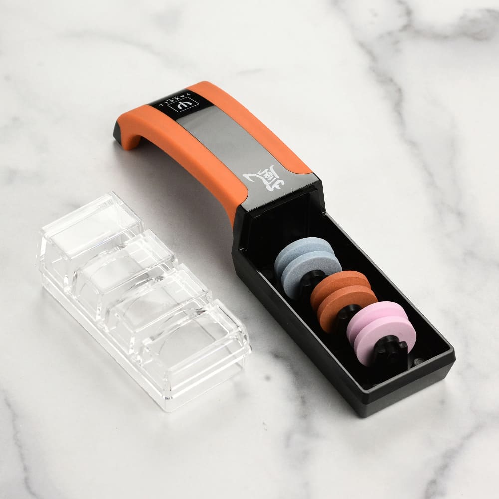 Эксклюзивная 3-ступенчатая точилка Yaxell предназначена для всех ножей с сердцевиной VG10 и SG2. Обеспечивает острую кромку лезвия ножа с заточкой под углом 12°. Для использования достаточно снять крышку, налить воду в отсек и закріть крышку. Лезвие ножа необходимо вставить в одну из канавок под углом 90°. Используя умеренное давление, потяните нож на себя примерно. Повторите тот же процесс, используя другие канавки. После заточки вымойте нож вручную в горячей воде и полностью высушите мягкой тканью.