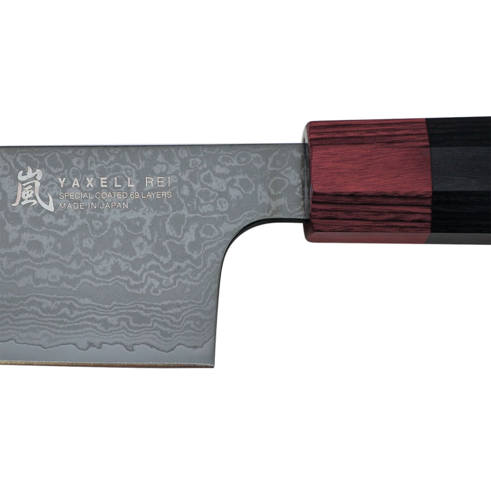 Премиальная восьмиугольная черно-красная ручка Pakka Wood (композит дерева и смолы) украшена самурайским гербом, разработанная опытными дизайнерами Yaxell, обеспечивает идеальный баланс и оптимальный контроль.