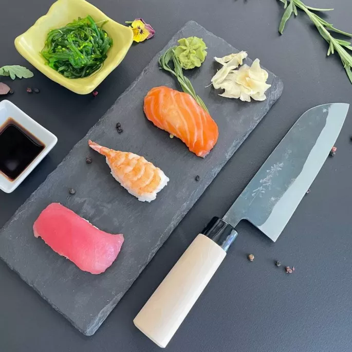 Нож выполнен в традиционном японском стиле из премиальных материалов – углеродистой стали SK5, ручка выполнена из древесины магнолии. Эргономичность, безупречная сбалансированность и прочность конструкции обеспечивают кухонному ножу надежность, безотказность и долговечность работы.