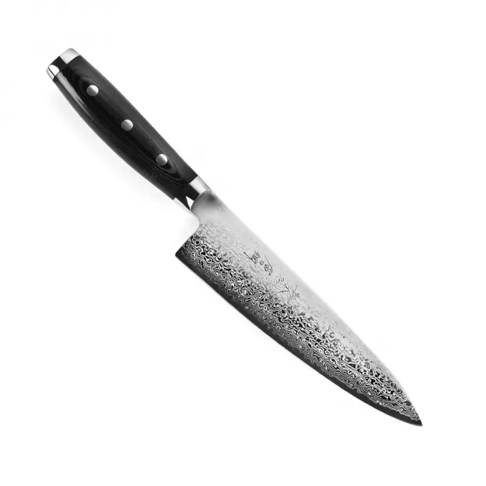 Японский шеф-нож серии GOU с лезвием из дамасской стали 20 см подходит для ежедневного использования на профессиональной или домашней кухне, поскольку выдерживает любую рабочую нагрузку. В основе высококачественная японская порошковя сталь SG2, покрытая защитными обкладками из 100 слоев нержавеющей стали с эффектным дамасским узором на лезвии.