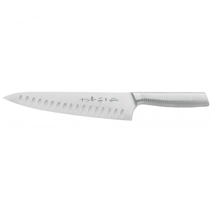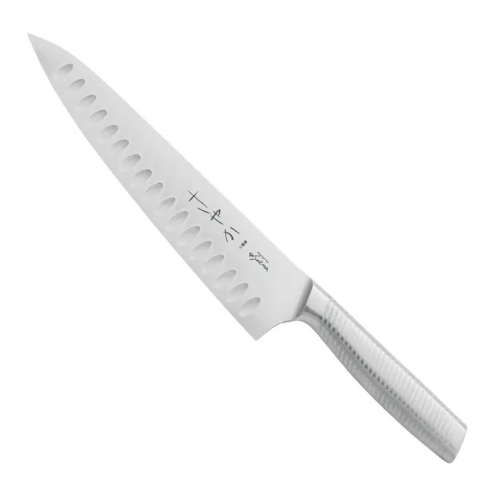 Нож имеет очень острую режущую кромку, симметричный угол заточки составляет 15°. Твердость лезвия - 61 единиц (HRC) по шкале Роквелла гарантирует долгую сохранность режущей способности поварского ножа.