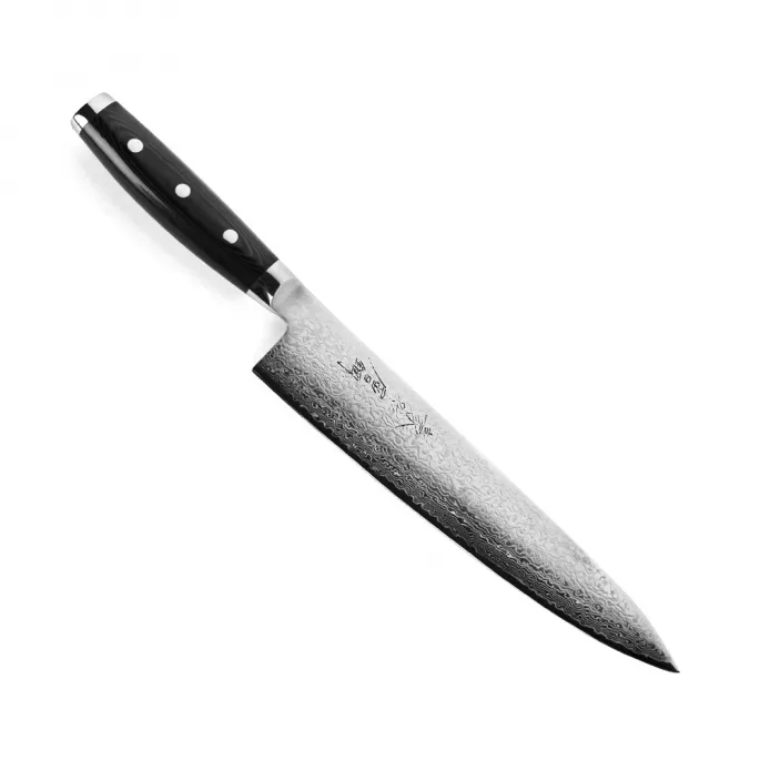 Японский шеф-нож серии GOU с лезвием из дамасской стали 25,5 см подходит для ежедневного использования на профессиональной или домашней кухне, поскольку выдерживает любую рабочую нагрузку. В основе высококачественная японская порошковая сталь SG2, покрытая защитными обкладками из 100 слоев нержавеющей стали с эффектным дамасским узором на лезвии.