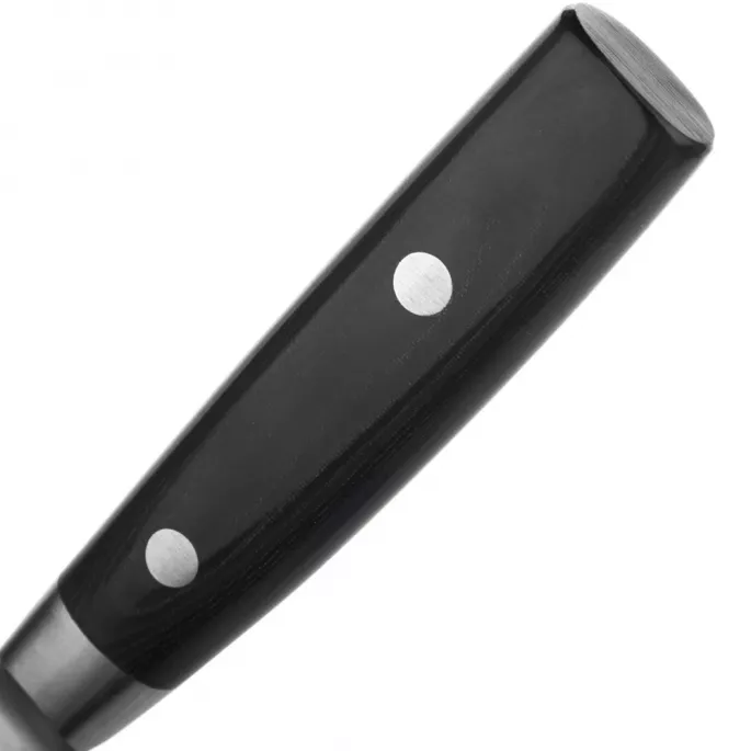 Идеально отполированная черная рукоятка Yaxell ZEN изготовлена из материала канва микарта - это лен, пропитанный смолой. Это сверхвыносливый и долговечный материал, который выдерживает интенсивные нагрузки, не впитывает запахи.