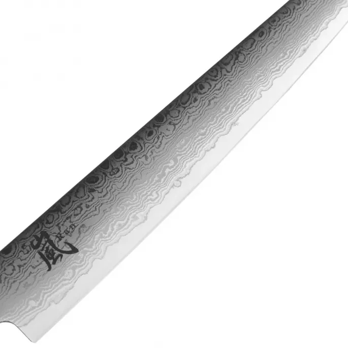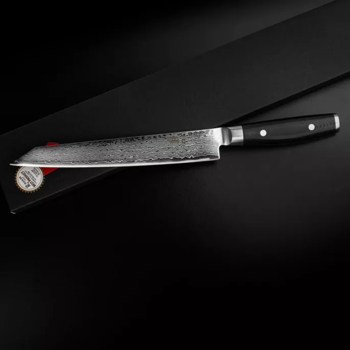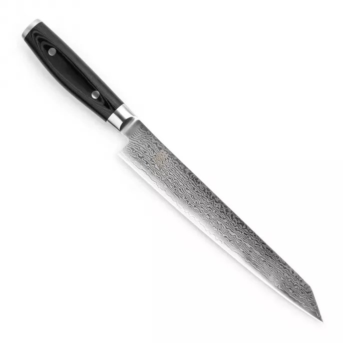 Японский нож для нарезки серии RAN с длинным лезвием из дамасской стали 25,5 см подходит для ежедневного использования на профессиональной или домашней кухне, поскольку выдерживает любую рабочую нагрузку. Благодаря длинному и ровному лезвию с острой режущей кромкой легко справится с деликатной нарезкой и слайсированием окорока, хамона и других продуктов.