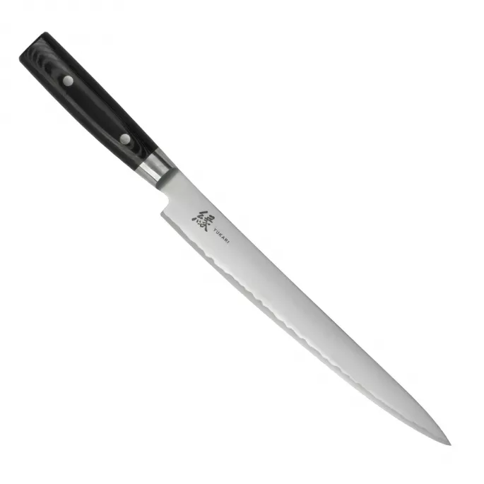 Японский нож для нарезки серии YUKARI с лезвием из дамасской стали 25,5 см подходит для ежедневного использования на профессиональной или домашней кухне, поскольку выдерживает любую рабочую нагрузку. Используется для нарезки разного вида продуктов. Имеет невысокую прямоугольную пятку и ровную линию режущего края, слегка скругленного к концу.