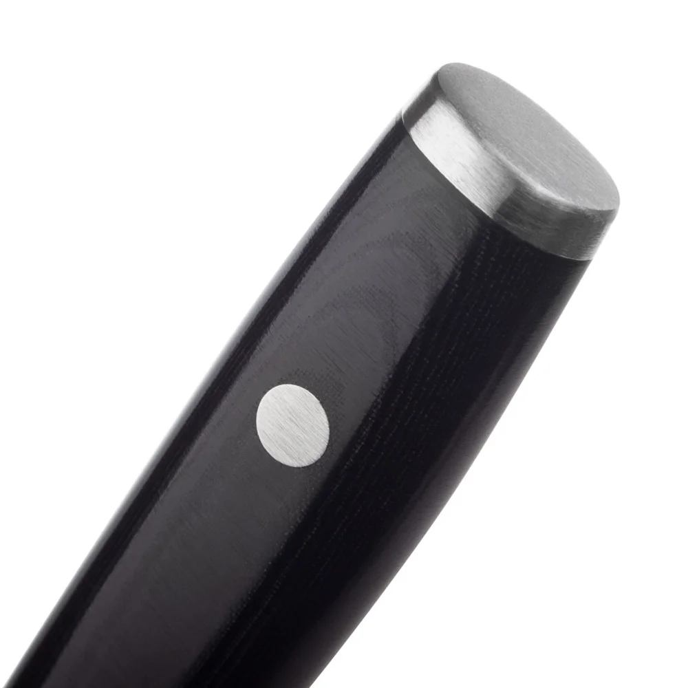 Идеально отполированная черная рукоятка кухонного ножа Yaxell RAN изготовлена из материала канва микарта - это лен, пропитанный смолой. Это сверхвыносливый и долговечный материал, который выдерживает интенсивные нагрузки, не впитывает запахи.