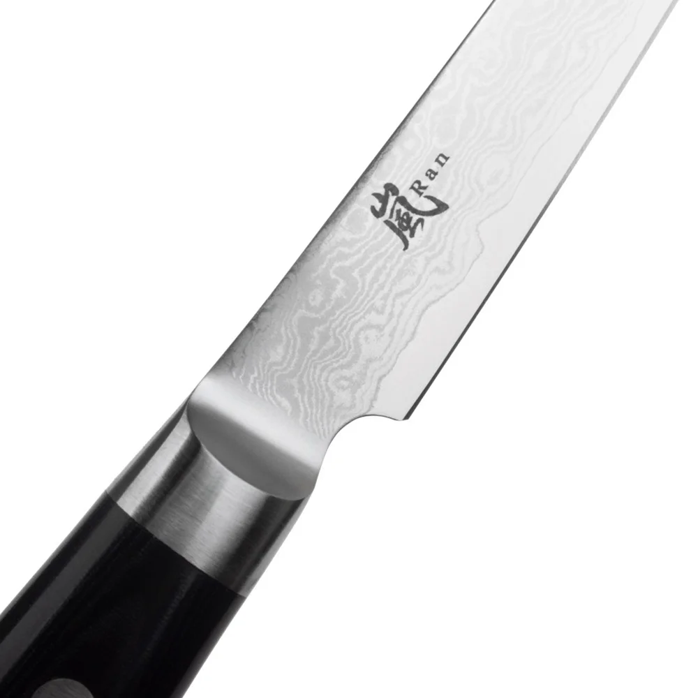 Японский нож для стейка серии RAN с лезвием из дамасской стали 11,3 см подходит больше для домашнего использования в кругу любителей сочных мясных стейков.