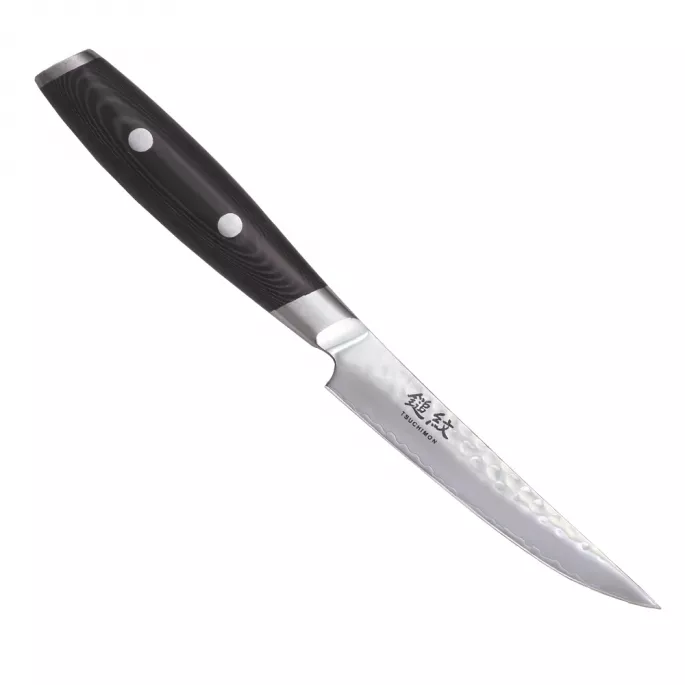Японский нож Сантоку серии TSUCHIMON с лезвием 11,3 см из дамасской стали подходит больше для домашнего использования в кругу любителей сочных мясных стейков.