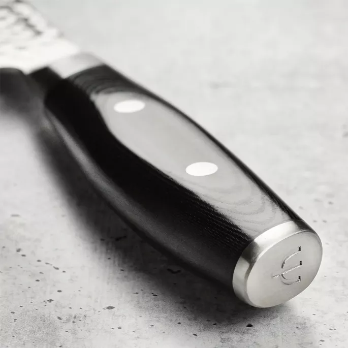 Идеально отполированная черная рукоятка Yaxell TSUCHIMON изготовлена из материала канва микарта - это лен, пропитанный смолой. Это сверхвыносливый и долговечный материал, который выдерживает интенсивные нагрузки, не впитывает запахи.