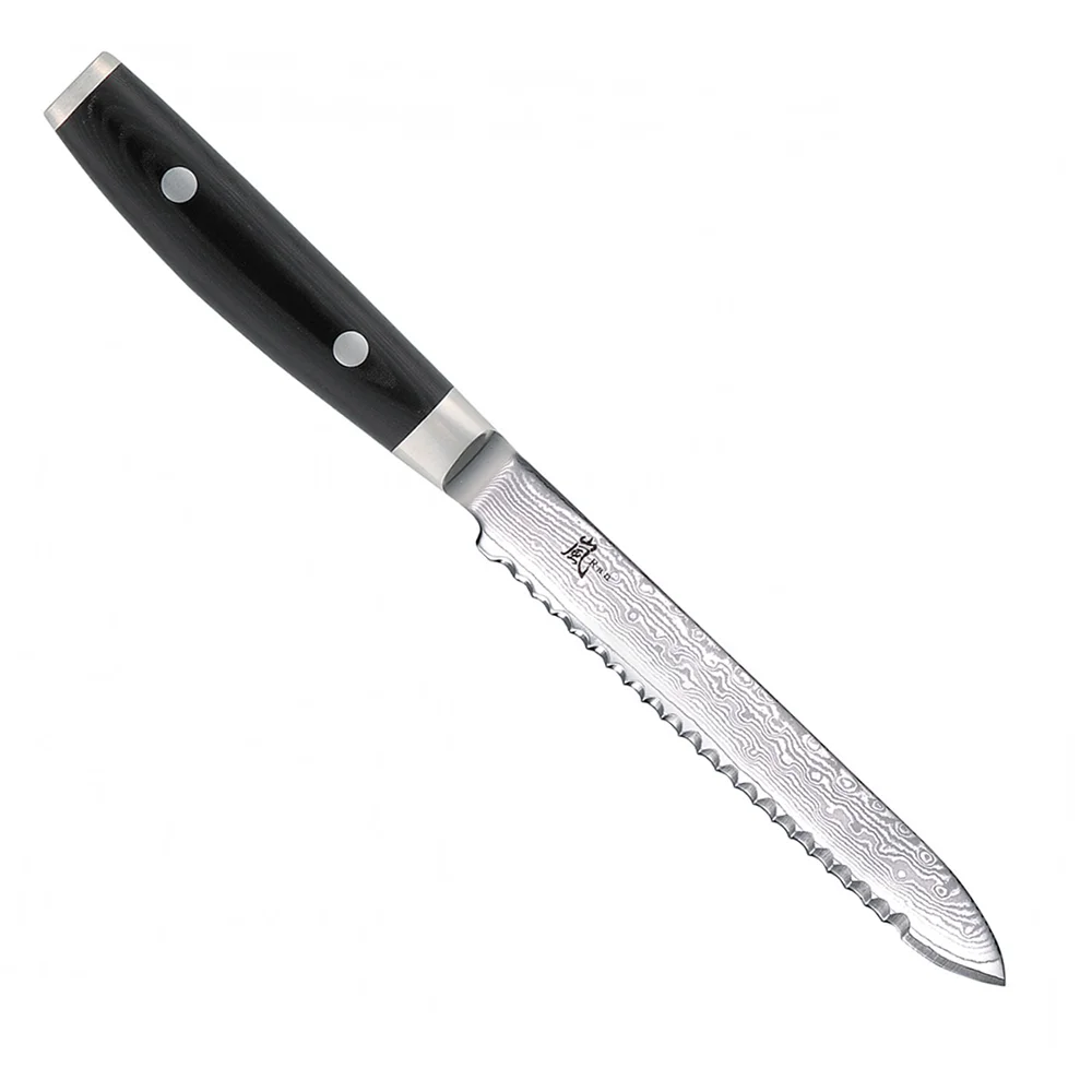 Японский нож для томатов серии RAN с серрейторным лезвием из дамасской стали 8 см подходит для ежедневного использования на профессиональной или домашней кухне, поскольку выдерживает любую рабочую нагрузку. Серейторное лезвие позволяет нарезать помидоры быстро без лишнего давления и без повреждения мякоти томатов.