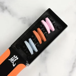 - Точильний камінь: заточення ножа на водному камені використовується навіть для дуже тупих інструментів. Камені мають різні рівні зернистості – для грубого заточення, базового робочого та фінішного полірування. Японці вважають заточення за допомогою каменю найнадійнішим та найякіснішим, що підходить для будь-якого виду сталі.