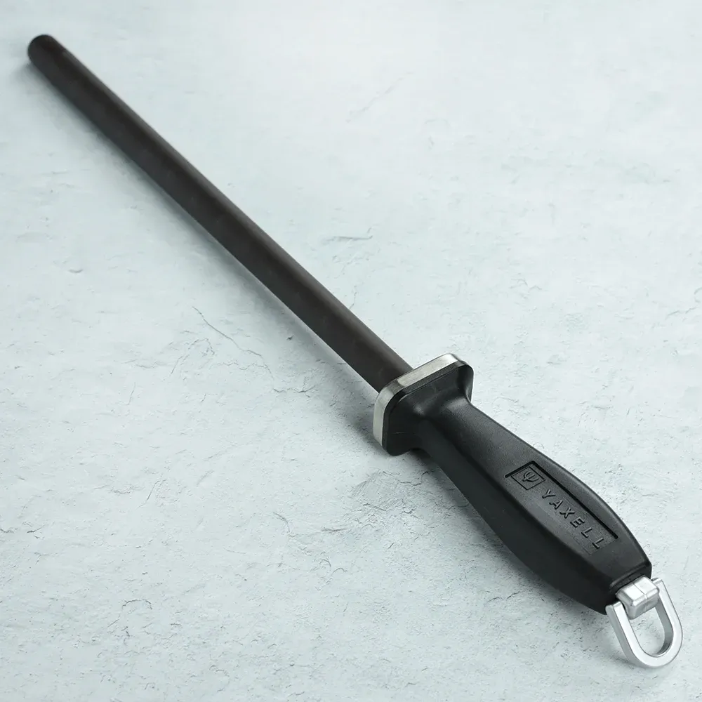 - Мусат: використовується для правки, вирівнювання ріжучої кромки, не знімає шари металу з леза. Може виготовлятися з різних матеріалів – від алмазу до кераміки. Підходить для підтримки заточення гострих ножів, особливо після щоденного готування.